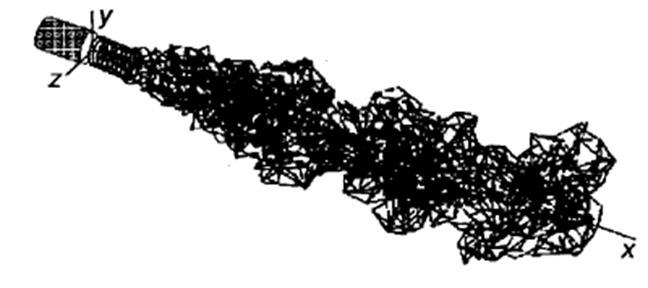 Одной из ответственных проверок построенной ММ стала задача об истечении струи из круглого сопла. Оказалось, что осесимметричная схема недостаточна (турбулентные течения не терпят искусственных ограничений). Зато пространственная нестационарная ММ привела к полному успеху. Рис. 3 показывает, как трансформируется вихревая граница струи. Начальный участок сохраняет осевую симметрию; затем она разрушается, но просматривается тенденция к формированию когерентных структур.