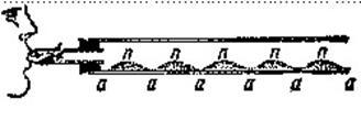 Поместим на одном конце стеклянной трубки свисток и рассыплем равномерно внутри трубки порошок ликоподия (споры растения). При вдувании воздуха в свисток порошок разбивается на кучки, как это показано на рисунке. Если дуть сильнее или слабее, то можно изменять число и расположение кучек, а также и высоту слышимого тона. Вершины кучек соответствуют узлам, а промежутки между кучками — пучностям. Обратите внимание, что на концах, где воздух может свободно колебаться, образуются пучности.