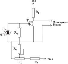 Перший каскад на транзисторі Т працює в ключовому режимі. При відсутності сигналу з ФЕП ключ знаходиться в режимі відсічки. При освітленні ФЕП ключ переходить у режим насичення і напруга на колекторі Т зменшується до 0,1 В.