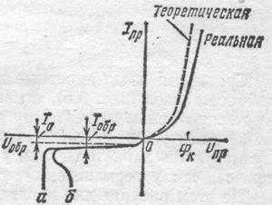 В области малых токов реальная и теоретическая характеристики совпадают. Но при больших прямых токах, а также при высоких обратных напряжениях характеристики расходятся, что является следствием ряда причин, не учтенных при теоретическом анализе процессов в электронно-дырочном переходе.
