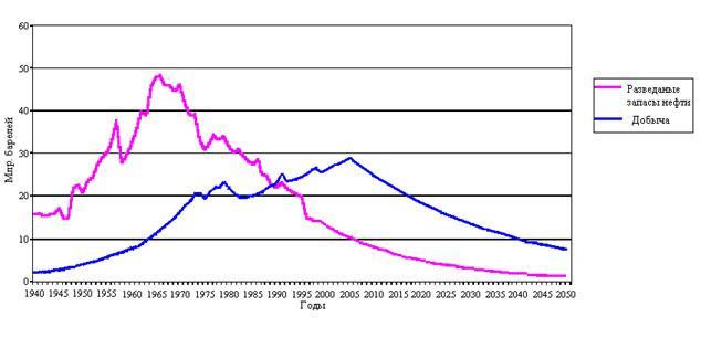 Проблема будущей нехватки нефти известна довольно давно. Является хорошо установленным фактом то, что на рубеже тысячелетий заканчивается период роста мировой добычи нефти и начинается ее долгое и неуклонное падение, которое должно закончиться истощением запасов. В 1956 году геолог King Hubbert предсказал, что добыча нефти в Америке достигнет своего пика в 1970 году. В том же 1970 году компания ЭССО предсказала, что мировая добыча достигнет пика где-то в 2000 году. В 1976 году Министерство энергетики Великобритании опубликовало доклад, в котором указало, что запасы нефти в Северном море достигнут пика к концу века, то есть в то же самое время, что и мировая добыча нефти. После прохождения пика добычи нефти все потребители по всему миру окажутся перед лицом огромных трудностей, не из-за дороговизны нефти, а из-за ее нехватки. Нефтяная экономика сегодня всецело зависит от приближающегося пика добычи. На графике показано, что пик ожидается в 2005 году. На самом деле он не будет иметь форму поворотного момента, а просто производство начнет медленно падать, цены будут расти все быстрее. Добыча нефти стабилизируется в течение 5 лет на более низком уровне. За этим последует резкий обвал, ведущий к истощению.