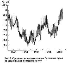 Точность определения неравномерности вращения Земли улучшилась в 1955 г. - после того как стали использоваться атомные часы. С этого момента появилась возможность регистрировать колебания скорости вращения Земли с периодами более одного месяца. Ход среднемесячных величин скорости вращения за период 1955-2000 гг. показан на рисунке 2. Скорость вращения Земли бывает наименьшей в апреле и ноябре, а наибольшей - в январе и июле. Январский максимум значительно меньше июльского. Разность между минимальной величиной отклонения длительности земных суток от эталонных в июле и максимальной в апреле или ноябре составляет 0.001 с.