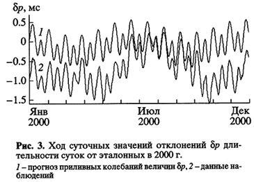 На рисунке 3 воспроизведен суточный ход значений отклонений длительности суток в 2000 г. Здесь, помимо сезонных изменений, обусловленных гидроме-теорологическими процессами, хорошо видны приливные колебания скорости вращения Земли. По величине размаха они немного уступают сезонным колебаниям, но их периоды в десятки раз короче сезонных (близки к 14 суткам).