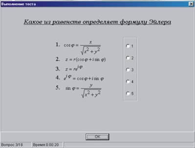 Учащемуся необходимо определить формулу Эйлера из пяти предложенных. Ответить следует «флажком» на соответствующем номере, после чего нажатием клавиши «ОК» совершается переход к следующему вопросу.