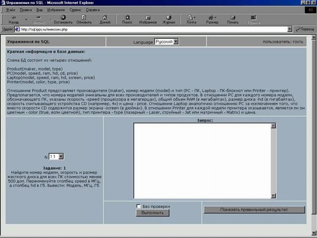 Схема взаимодействия пользователя с системой сводится к следующему. Для каждого упражнения приводится описание базы данных и на естественном языке (русском или английском, по выбору пользователя) формулируется задание на выборку. Пользователь должен написать оператор SELECT, реализующий выборку требуемых данных. Проверка запроса пользователя осуществляется, если нажать кнопку "Выполнить" (рис.1). Если запрос синтаксически правилен, но сформулирован неверно логически, будут возвращены данные запроса пользователя и данные правильного запроса. Одни только правильные данные можно получить, если нажать кнопку "Показать правильный результат". Кроме того, если установить флажок "Без проверки", можно писать любые запросы на получение данных из учебной базы данных; при этом проверка запроса пользователя не выполняется.