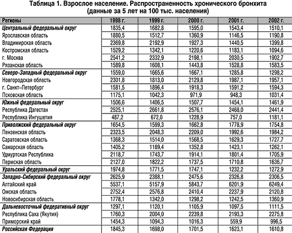 Работа по борьбе с ХОБЛ оказала большое влияние на практическое здравоохранение, о чем можно судить по данным официальной медицинской статистики. Так, врачи чаще стали выявлять больных с ХОБЛ, ставить диагноз этой болезни. В таблице 1 приводятся данные МЗ РФ по распространению ХОБЛ в различных регионах страны.