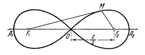 Обратимся к кривой, описываемой точкой М на плоскости так, что остается неизменным произведение р расстояний этой точки до двух определенных точек F1