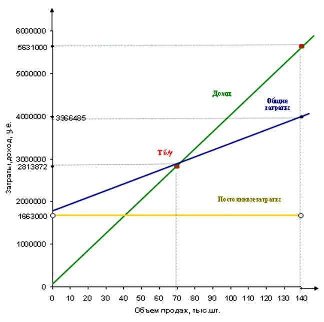 Пояснение: данный расчет взят как пример по отдельному виду продукции. Реальный расчет точки безубыточности, в рамках курсовой работы, будет приведен в соответствующей главе.