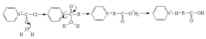 Òðåòè÷íûå àìèíû âçàèìîäåéñòâóþò ñ õëîàíãèäðèäàìè, äàâàÿ ÷åòâåðòè÷íûå ñîëè, êîòîðûå ñàìè ÿâëÿþòñÿ àöèëèðóþùèìè àãåíòàìè. Примером такой реакции служит образование солей в пиридине. òàêàÿ ñîëü àöèëèðóåò âîäó. Ïðîöåññ â öåëîì ïðåäñòàâëÿåò ñîáîé ãèäðîëèç àöèëãàëîãåíèäà, êàòàëèçèðóåìûé ïèðèäèíîì.