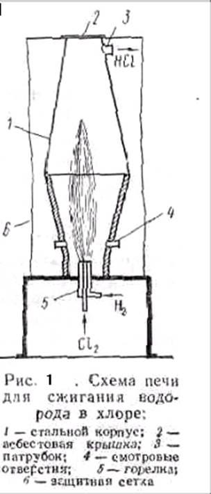 Синтез проводят при избытке 5—10% водорода и высокой температуре в печи, корпус которой изготовляют из углеродистой или легированной стали, а крышку из асбеста. Нижняя часть печи (рис.1) выложена огнеупорным материалом. В ней помещена горелка, состоящая из двух концентрически расположенных стальных трубок. По наружной трубке в печь подается водород, а по внутренней — хлор. Которые на выходе из горелки смешиваются и спокойно реагируют; образуя факел горения с температурой 2000—2400° С.