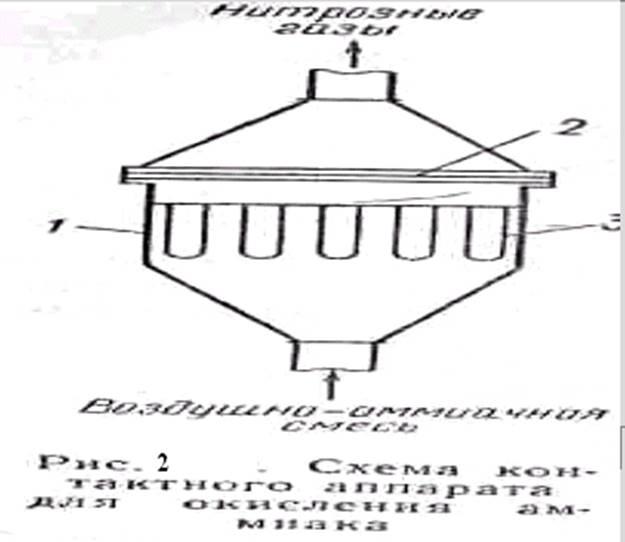 Для окисления амиака. Образовавшиеся нитрозные газы при температуре 800°С выходят из аппарата и, пройдя котел-утилизатор 3,