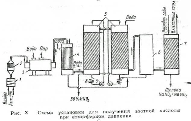Нитрит натрия затем окисляется до нитрата натрия.На рис. 3 показана принципиальная схема получения азотной кислоты при атмосферном давлении. Воздух и аммиак после очистки от примесей подаются в смеситель1, а затем в контактный аппарат 2.