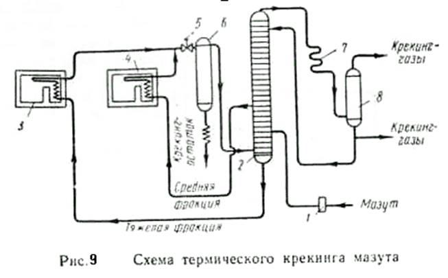 при температуре 350—500° С. На рис.9 показана схема крекинга мазута. Мазут насосом 1 подается на одну из нижних тарелок ректификационной колонны 2,
