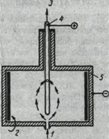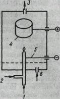 Детектор электронного захвата представляет собой ячейку с двумя электродами (ионизационная камера), в которую поступает газ-носитель, прошедший через хроматографическую колонку (рис. 8). В камере он облучается постоянным потоком b-электронов, поскольку один из электродов изготовлен из материала, являющегося источником излучения (63