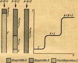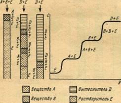 Заполненную сорбентом колонку промывают чистым газом Е, обычно сорбирующимся слабее всех остальных компонентов смеси. Затем, не прекращая потока газа Е, в колонку вводят порцию анализируемой смеси, например, вещества А и В, которые сорбируются в верхних слоях сорбента (рис. 1, а) и вследствие движения газа постепенно перемещаются вдоль слоя сорбента с различными для каждого компонента скоростями. В результате зона лучше сорбирующегося вещества, например В, постоянно отстает от зоны хуже сорбирующегося вещества А (рис. 1, б, в) и при достаточной длине колонки смесь веществ А и В разделяется (рис. 1,г). Изменение концентрации вымываемых веществ по выходе из колонки может быть зафиксировано в виде непрерывной кривой, называемой хроматограммой