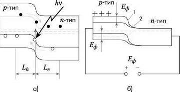 | Рис.3. Зонная модель разомкнутого p-n-перехода: а) - в начальный момент освещения; б) - изменение зонной модели под действием постоянного освещения и возникновение фотоЭДС