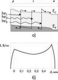 | Рис.7. Энергетическая зонная диаграмма p-i-n-структуры (а) и расчетное распределение электрического поля (б)