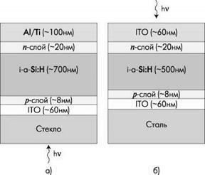 | Рис.8. р-i-n-Структура на стеклянной (а) и стальной (б) подложке