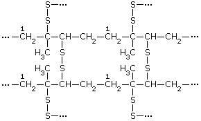Из смеси каучука с серой, наполнителями (особенно важным наполнителем служит сажа) и другими веществами формуют нужные изделия и подвергают их нагреванию. При этих условиях атомы серы присоединяются к двойным связям макромолекул каучука и «сшивают» их, образуя дисульфидные «мостики». В результате образуется гигантская молекула, имеющая три измерения в пространстве — как бы длину, ширину и толщину. Полимер приобретает пространственную структуру: