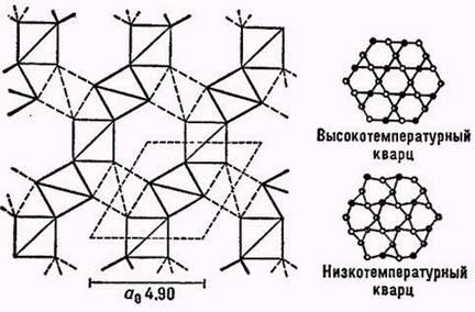 ) в интервале температур 870—573 °С, и тригональный (b-К.), устойчивый при температуре ниже 573 °С. b-К. наиболее широко встречается в природе. Он кристаллизуется в классе тригонального трапецоэдра тригональной системы. Кристаллическая структура каркасного типа построена из кремне-кислородных тетраэдров, расположенных винтообразно (с правым или левым ходом винта) по отношению к главной оси кристалла. В зависимости от этого различают правые и левые структурно-морфологические формы кристаллов, различающиеся внешне по симметрии расположения некоторых граней (например, трапецоэдра и др.). Отсутствие плоскостей и центра симметрии у кристаллов К. обусловливает наличие пьезоэлектрических и пироэлектрических свойств.