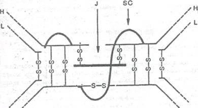 В настоящее время на основании изучения первичной структуры полипептидных цепей выдвинута так называемая "доменная" гипотеза строения иммуноглобулинов, согласно которой молекулу иммуноглобулинов можно разбить на участки с относительно независимыми конфигурациями в виде глобул. Каждый домен состоит приблизительно из 100-110 аминокислотных остатков и имеет одну дксудьфидную связь, которая связывает участки цепей, образуя петлю из 60 аминокислотных остатков (Еdelman, 1970; Незлин, Рохлин, 1970; Роljak, 1972).