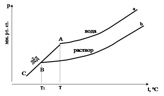 На графике линия Аа изображает кривую давления пара чистой воды, а линия Bb – кривую давления пара над раствором. Так как при любой температуре давление пара раствора меньше давления пара чистой воды, то линия Bb лежит ниже линии Аа. Линия АС изображает кривую давления пара льда. Мы уже говорили, что при температуре замерзания давления паров твёрдой и жидкой фаз растворителя или твёрдого растворителя и раствора должно быть одинаковым. Этому условию отвечают точки А и В пересечения кривых Аа и Bb с кривой АС. Температуры замерзания воды и раствора определяются как проекции точек А и В на ось абсцисс. В этом случае, как видно из графика, температуры Т и Т1, расположены в обратном порядке, то есть температура замерзания раствора ниже температуры замерзания воды.