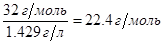 Экспериментально установлено, что масса 1л кислорода при нормальных условиях (при температуре 273ºК (0ºС) и давлении 1 атм.) равна 1,429г. Следовательно, объем, занимаемый 1 молем при этих условиях, равен: