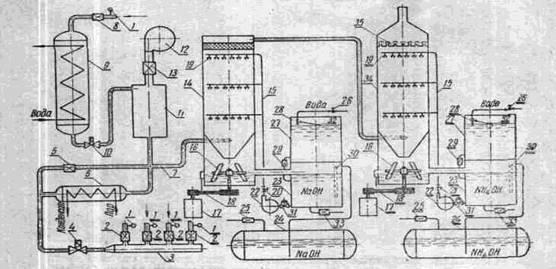 Рис. 2. Схема установки по очистке газов от окислов азота в равно проточной полой башне.