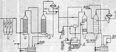 . Схема установки показана на рис. 2. Основным аппаратом является полый равно проточный абсорбер, представляющий собой цилиндрическую башню, в верхней части которой установлен центробежный объемный распылитель.