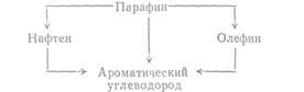 ); при этом получается относительно больше парафинов изостроения и моноциклических пятичленных нафтенов. Для производства высококачественного бензина наиболее важной реакцией при обычном гидрокрекинге является частичное гидрирование полициклических ароматических структур с последующим разрывом насыщенных колец и образованием замещенных моноциклических ароматических углеводородов. Боковые цепи, появляющиеся в результате такого разрыва, легко отщепляются.