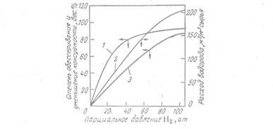 Рис. Влияние парциального давления водорода на степень гидрирования сернистых соединений в тяжелом циркулирующем крекинг-газойля: