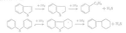Органические соединения серы в условиях гидрогенизационных процессов превращаются в соответствующие углеводороды и сероводород; реакция может проходить через образование промежуточных сернистых соединений. Меркаптаны, сульфиды и дисульфиды легко гидрируются в сравнительно мягких условиях. В циклических сероорганических соединениях под воздействием водорода происходит насыщение с последующим разрывом кольца и образованием соответствующего парафинового или алкилароматического углеводорода. В качестве примера приведем две схемы преобразования более сложных сероорганических соединений — бензтиофенов и дибензтиофенов: