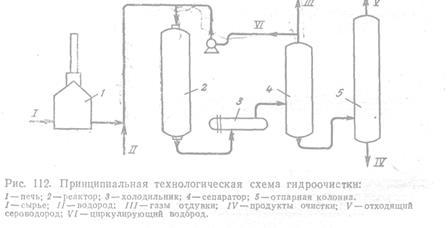 нефтяных дистиллятов является одним из наиболее распространенных процессов, особенно при переработке сернистых и высокосернистых нефтей. Основной целью гидроочистки нефтяных дистиллятов является уменьшение содержания в них сернистых, азотистых и металлоорганических соединений. При гидроочистке происходит разложение органических веществ, содержащих серу и азот. Они реагируют с водородом, циркулирующим в системе, с образованием сероводорода и аммиака, которые удаляют из системы.