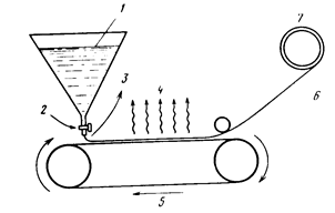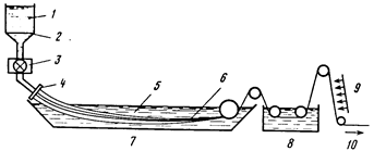 свежеспряденное волокно; 7 — ванна для коагуляции и осаждения; 8 —