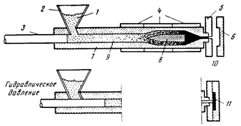 дозирующий насос; б — расплав; 7— многоканальный мундштук, 8 —