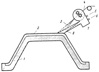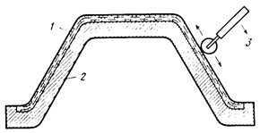 1 — форма; 2 — распыленная смесь нарезанного волокна и смолы; 3