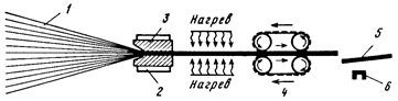 1 — непрерывный пучок волокон, пропитанный смолой и отвердителем; 2 — нагревательный элемент; 3 —