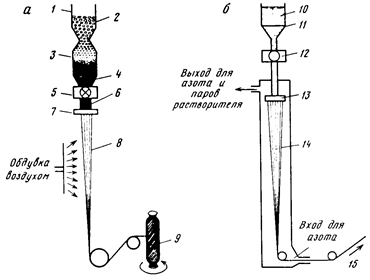СУХОЕ ПРЯДЕНИЕ. Большое количество таких традиционных полимеров, как ПВХ или полиакрилонитрил, перерабатывают в волокна в крупных масштабах в процессе сухого прядения. Суть этого процесса показана на рис.17. Полимер растворяют в соответствующем растворителе с образованием высококонцентрированного раствора. Вязкость раствора регулируют увеличением температуры. Горячий вязкий раствор полимера продавливают через фильеры, получая, таким образом, тонкие непрерывные струйки. Волокно из этих струек образуется при простом испарении растворителя. Испарение растворителя может быть ускорено путем обдувания встречным потоком сухого азота. Волокна, образующиеся из раствора полимера, в конце концов наматывают на катушки. Скорость прядения волокон может достигать 1000 м/мин. Промышленные ацетатцеллюлозные волокна, полученные из 35%-ного раствора полимера в ацетоне при 40 °С, служат типичным примером получения волокон методом сухого прядения.