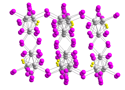 Это кластерное соединение со связностью=2. Слой состоит из двух слоёв, образованных треугольниками из атомов Nb. Они соединяются мостиковыми атомами I. Все атомы Nb равноценны, а атомы I есть двух типов(I1