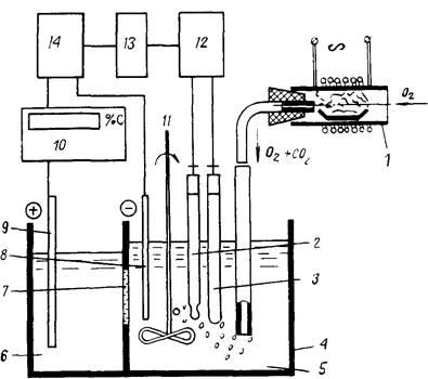 Закисление раствора приводит к изменению э.д.с. электродной системы (2), (3) и соответствующему изменению выходного напряжения высокоомного усилителя рН-метра (12), которое затем преобразователем (13) преобразуется в импульсы напряжения с длительностью, пропорциональной значению этого напряжения. Импульсы напряжения стабилизатором тока (14) преобразуются в импульсы тока, протекающие по участку цепи: анод (9)-вспомогательный раствор (6)-токопроницаемая целлофановая перегородка (7)-поглотительный раствор (5)-катод (8), вызывают восстановление ионов водорода на катоде, нейтрализуя кислоту, образующуюся при поглощении углекислого газа. Количество электричества, потребовавшегося для нейтрализации, фиксируется пересчётным и индикаторным устройством (10), отградуированным в % массовой доли углерода.