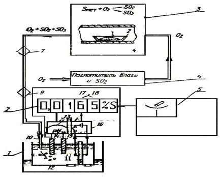 В анализаторах применён метод автоматического титрования по величине рН. Функциональная схема, поясняющая принцип работы анализаторов, приведена на рис.2. Навеска стали, помещённая в фарфоровую лодочку, сжигается в трубчатой печи (1) в потоке очищенного от примесей кислорода. Образовавшийся при сжигании содержавшегося в стали углерода углекислый газ уносится потоком кислорода в электролитическую ячейку (4) датчика и поглощается в ней раствором (5), вызывая его закисление.