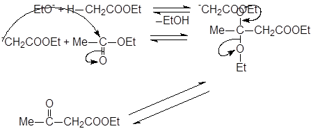 При обработке сложных эфиров, содержащих атом водорода в a-положении, сильным основанием (этилат натрия), происходит конденсация, приводящая к b-кетоэфирам. Эта реакция называется конденсацией Кляйзена