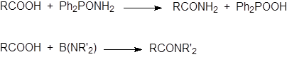 Кислоты можно превратить в амиды также нагреванием с амидами других карбоновых кислот (обмен), сульфоновых или фосфиновых кислот или действием трис(алкиламино)боранов [B(NHR’)3