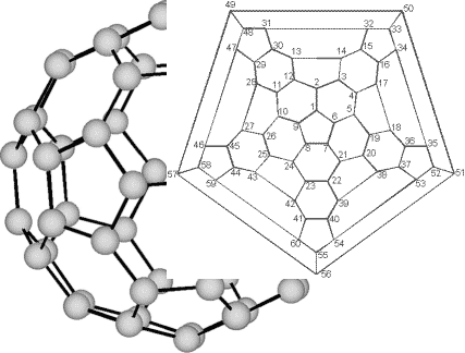 , где цифры 5 и 6 указывают на структурные единицы молекулы - пятиугольники и шестиугольники, а цифра 60 обозначает общее число атомов углерода в молекуле. Так как у простейших фуллеренов существует только по одному стабильному изомеру, их названия упрощают до фуллерена-60 и фуллерена-70. При записи структурных формул атомы углерода с обратной стороны сферы опускают для ясности (Рисунок 2). Шлегель предложил нумеровать атомы углерода по часовой стрелке, начиная с шестиугольника (Рисунок 3).