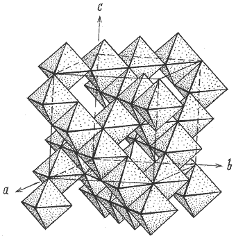 находятся приблизительно в плотнейшей кубической упаковке. Ячейка содержит тетраэдрические пустоты, число которых 64 (узлы А), и октаэдрические пустоты в количестве 32 (узлы В). Восемь узлов А и 16 узлов В занимают катионы, расположенные таким образом, что ряды заполненных ими октаэдров, соединённых между собой рёбрами, вытягиваются вдоль одной диагонали куба, связываясь в цепочки за счёт занятых тетраэдров. В результате образуется один слой (рис. е). Тетраэдры соединяют его с октаэдрами соседнего слоя, который располагается вдоль другой диагонали грани куба. Четыре таких слоя образуют элементарную ячейку. Каждый атом кислорода является общим для двух октаэдров и одного тетраэдра. Катионы представлены двумя типами: А2+