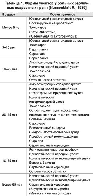 При диагностике увеитов следует учитывать возраст больных, так как известно, что в различные возрастные периоды встречаются разные формы воспалительных заболеваний глаз (таблица 1).