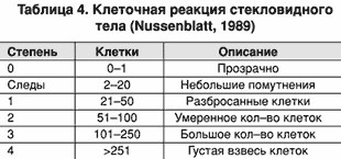 Клеточная реакция влаги передней камеры показывает активность воспаления радужки и цилиарного тела. Первично во влаге передней камеры появляются лимфоциты, однако может присутствовать и достаточное количество лейкоцитов. Степень клеточной реакции, согласно данным различных авторов, представлена в таблице 3.