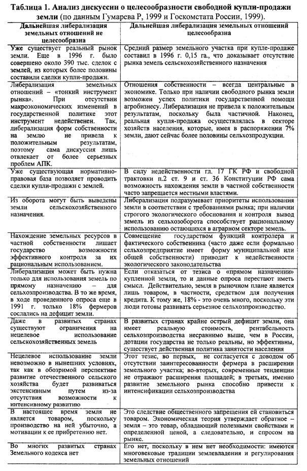 Проведем анализ достаточно типичного мнения о недопустимости свободного рынка и нецелевого использования земли, высказанного Р. Гумаревым. В приведенной таблице (табл. 1) левая колонка представляет собой мнение Р. Гумарева, правая - аргументы автора.