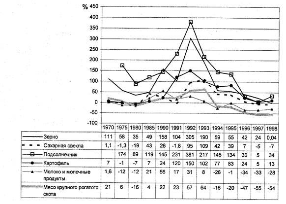Отметим, что, возможно, роль важнейшего, как считается, фактора -невнимания государства к сельским проблемам, - в современных негативных процессах преувеличена. Как видно на рис. 6, кризис начала 70-х годов вовсе не был связан с отсутствием государственной опеки. Лишь в 1992 году мы видим явные результаты «реформы». Дальнейшие спады - в 1994 и 1998 гг. -были вызваны скорее причинами финансового порядка - окончанием действия льготных кредитов и финансовым кризисом 1998 г.