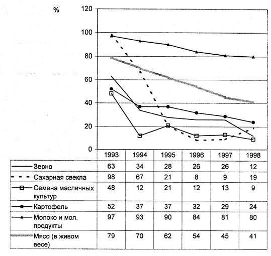 В России сельскохозяйственные предприятия чаще всего низкорентабельны. Резкий спад рентабельности производства основных видов сельскохозяйственной продукции в середине 90-х годов связано со снижением доли государственных закупок по фиксированным ценам и, соответственно, снижением прибыли (рис. 9 и 10). Следует участь также изношенность основных фондов и увеличение издержек на их поддержание. Пик рентабельности в начале 90-х годов следует, в первую очередь, объяснять резким ростом цен на продукты питания.